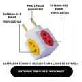 Adaptador de tomada em formato cubo com 4 lados de entrada, incluindo tomadas tripolares (3 pinos) e pino chato (2 pinos). Compacto, seguro e ideal para ligar vários dispositivos ao mesmo tempo, perfeito para viagens, quartos de hotel, escritório ou casa.